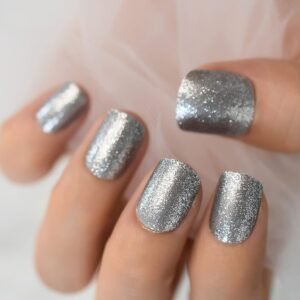 Silver Glitter Press on Nails Square Artificial Short False Nail Tip for Office Home Fake Finger Nail Faux Ongle for Women Girl
