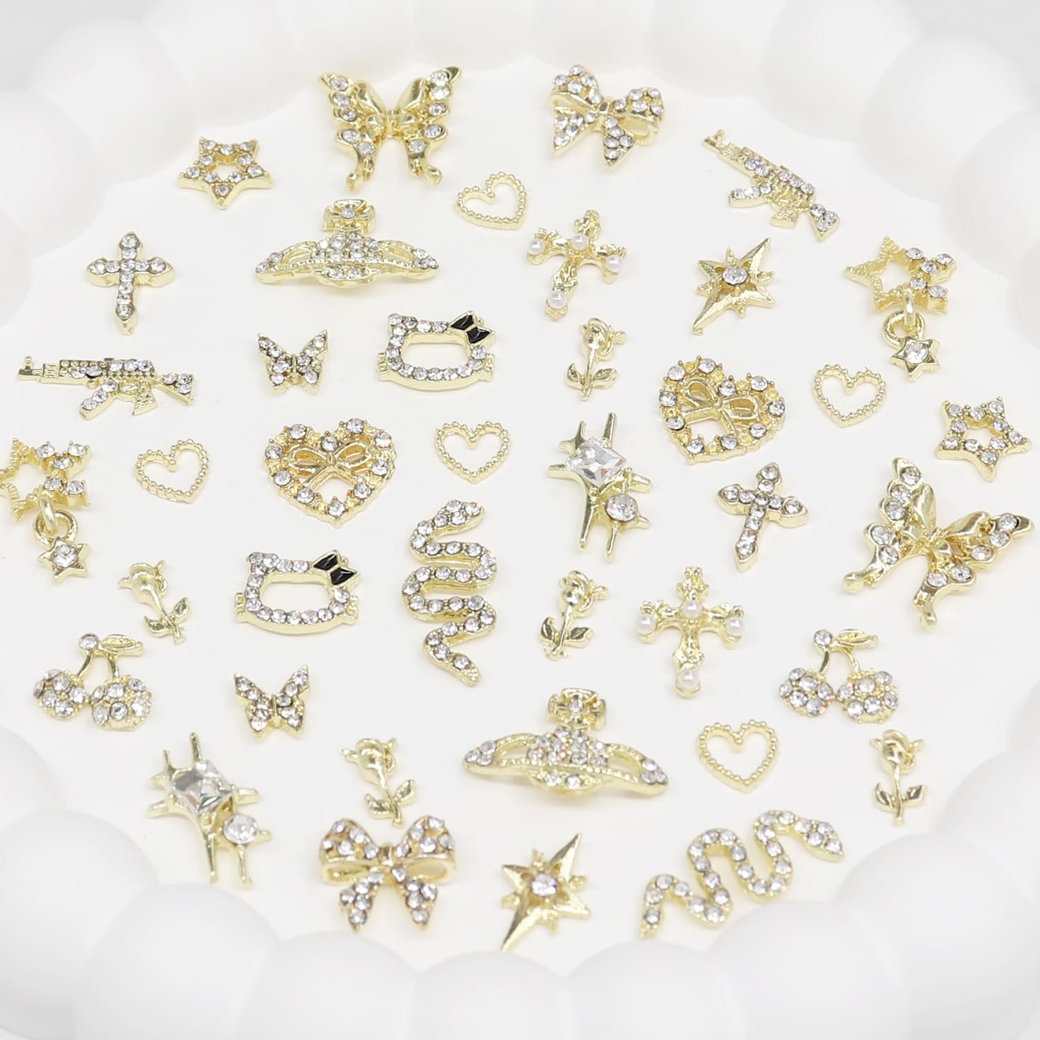 - You will get 40pcs nail charms features an array of eye-catching designs including kitty, gun, star, heart, snake, bow, rose and butterfly motifs adorned with sparkling rhinestone gems. Total 17 styles. Each inlaid with rhinestones design contains 2 pieces and the small hearts and small roses contains 5 pieces.