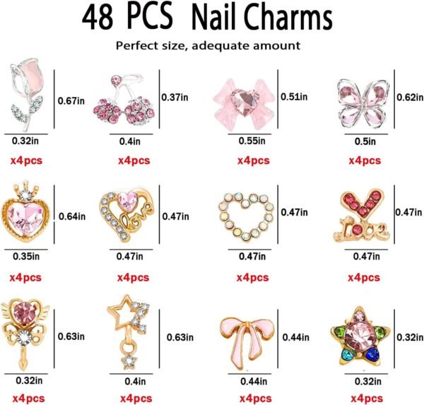 • Value Pack: You will get 48 Pcs nail charms, 12 Styles, 4pcs each Styles, with Heart, Star, Cherry, Tulips, and more. with rhinestones and gems, These exquisite nail charms add luxury to your nail.