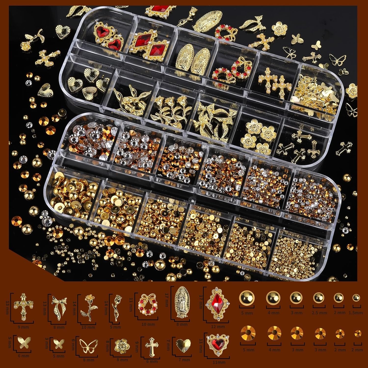 - 12 Styles of 3D Gold Charms for Nails & Mixed Sizes of Gold Pearls and Gems for Nails: One box contains 12 styles of gold charms, like gold heart, rhombus, cross, Christmas wreath, Virgin Mary, butterflies, gold flower, bowknot, great 3D sense effect can enhance the overall design’s refinement and sense of luxury; Another box come with 6 sizes half round gold nail pearls(1.5/2/2.5/3/4/5mm) and 4 different sizes of gold gems(2/3/4/5mm, 2 and 3mm have 2 grids), suitable for nail art or DIY craft