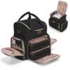 - NAIL LAMP SECTION: The upper section with mesh pocket and elastic bands for keeping a regular nail dryer (approx size 9″ x 7.5″ x 4.5″), bottles of nail remover and other tools.