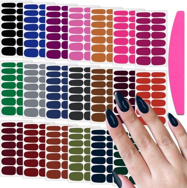 - Package Includes: 20 sheets of nail polish stickers for women + 1 nail file. Each nail sheet measures approximately 10 x 5.5 cm (4 x 2.2 inches), with a total of 280 pieces across 7 different sizes. With a variety of styles and colors, you’ll always have gorgeous nails at your fingertips!